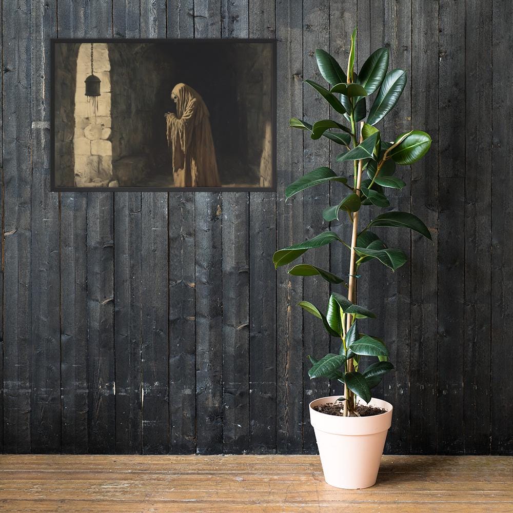 Step into a gothic reverie: “Dungeon Grim Reaper” is a visceral, haunting vision rendered in shadow, bone, and whispered dread. The central figure is the Reaper, draped in tattered black robes, skeletal countenance half-hidden in hooded gloom, scythe in hand—its blade gleaming faintly. He stands in a subterranean chamber or dungeon: crumbling stone walls, dripping arches, and tendrils of fog curling at his feet.