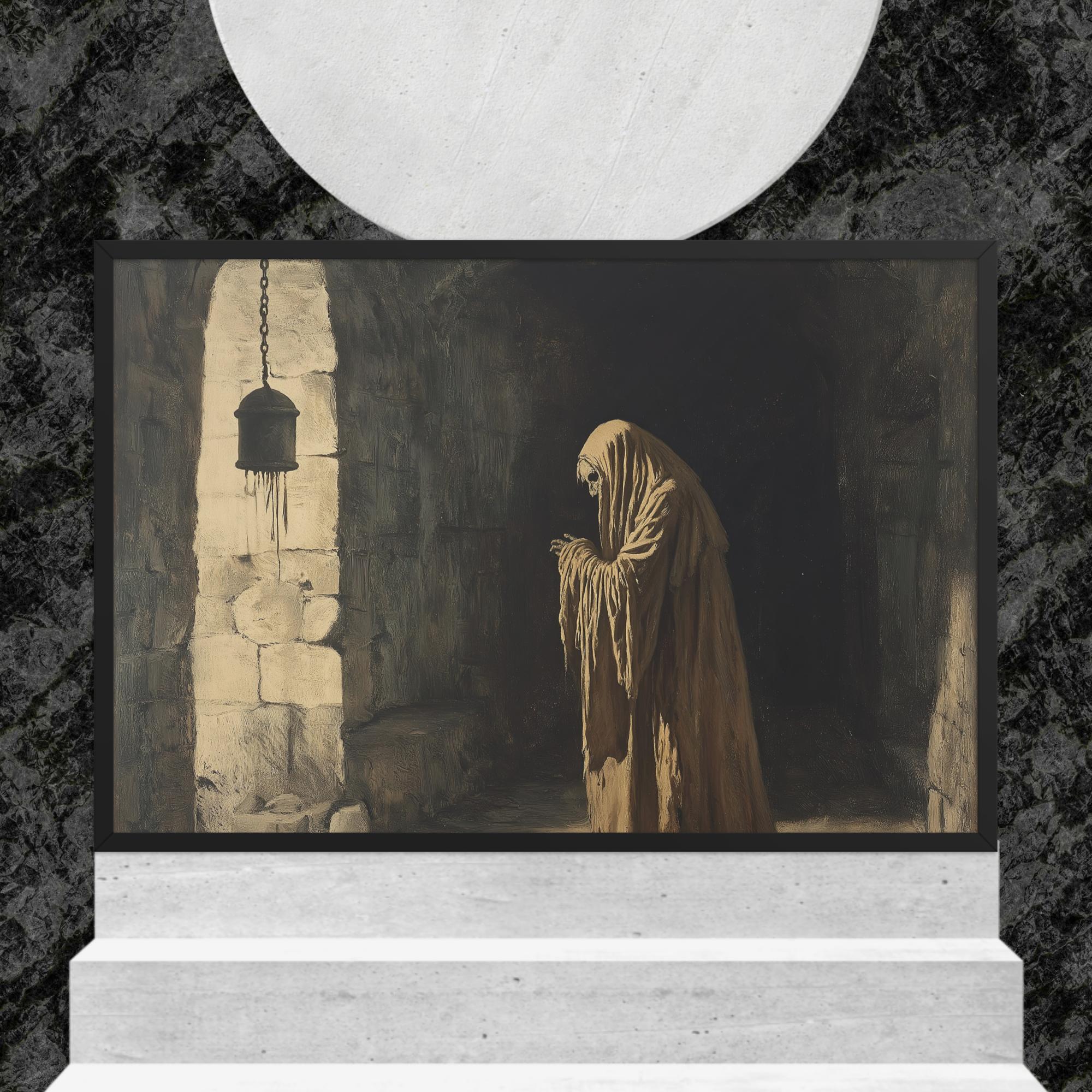 Light is scarce but electric: a pale glow seeps through cracks, casting elongated shadows. The bones, the drapery, the unsettling textures—each is etched with detail so sharp you expect dust motes to drift in the beam. Around him, faint motifs whisper in the darkness: chains, skulls, runic arches, ghostly echoes. There’s atmosphere—not mere darkness. You feel weight, depth, chill.