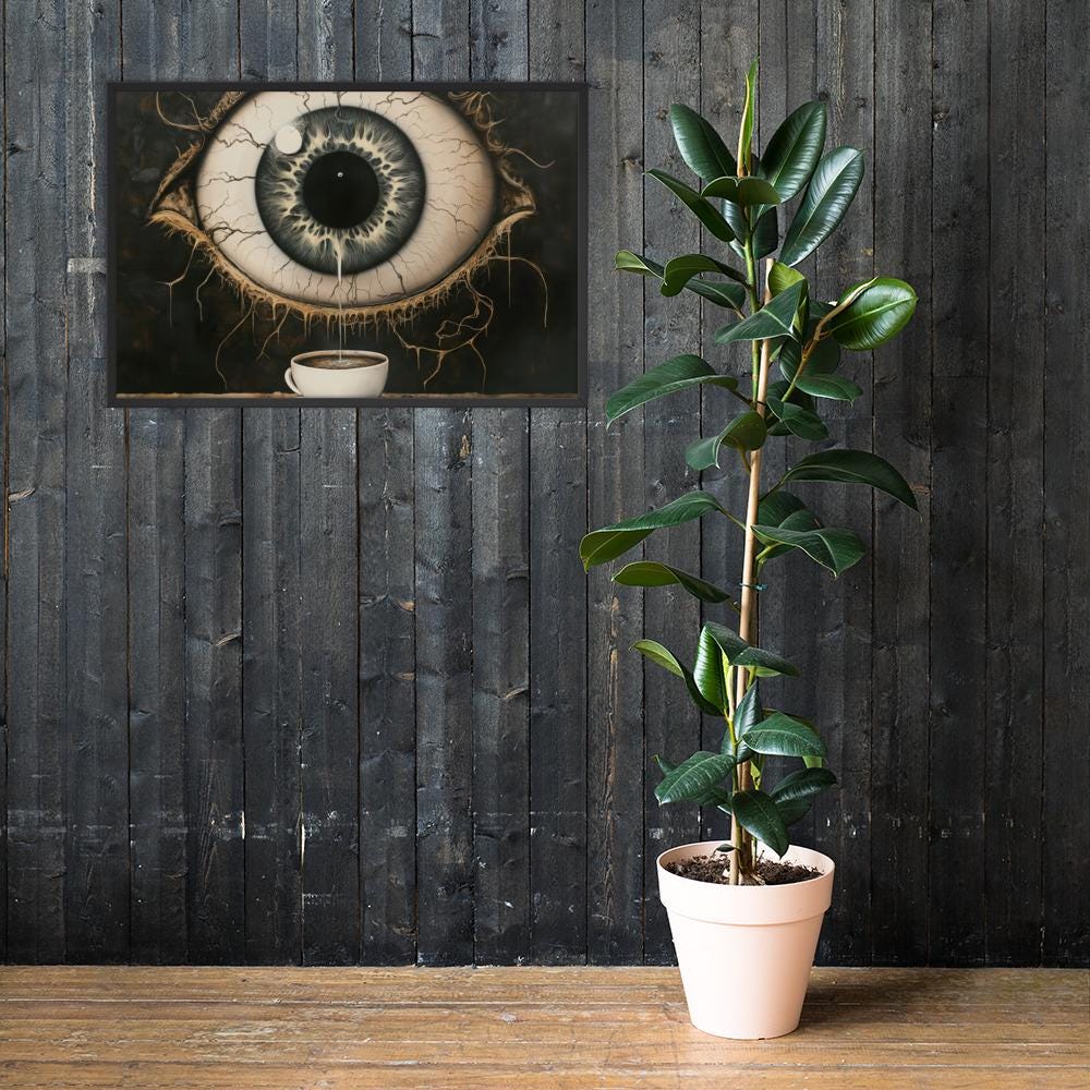 From the moment your gaze meets this piece, you sense its pulse. A single, oversized eye commands the frame—its iris alive with swirling energy, almost like smoke caught in motion. Electric lines and subtle distortions thread outwards, suggesting caffeine’s rush, that jittery excitement crawling beneath the skin.