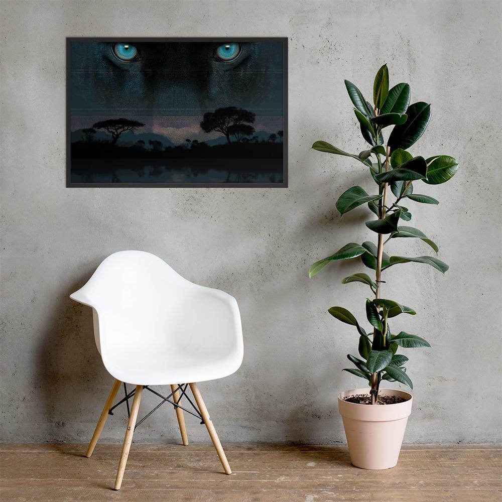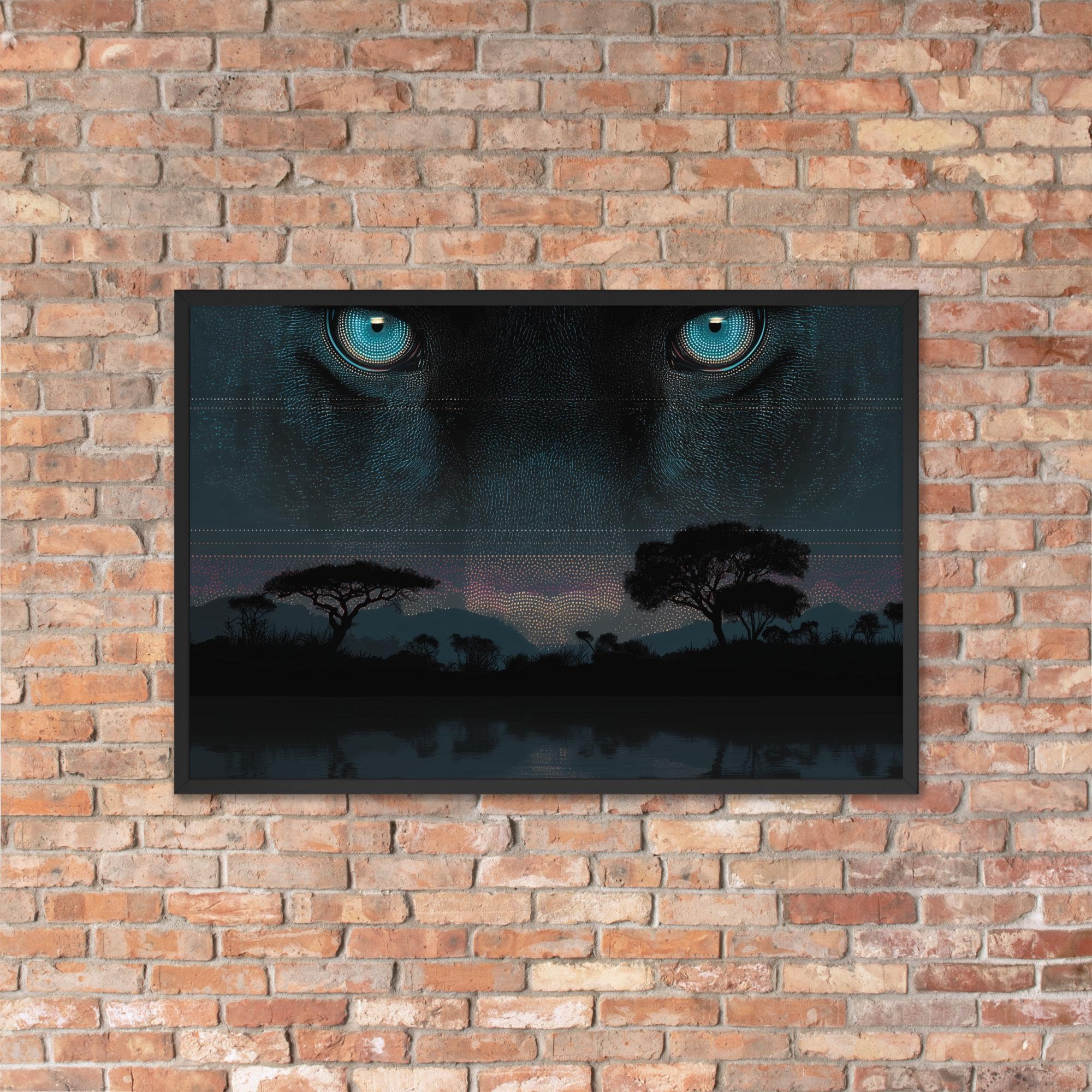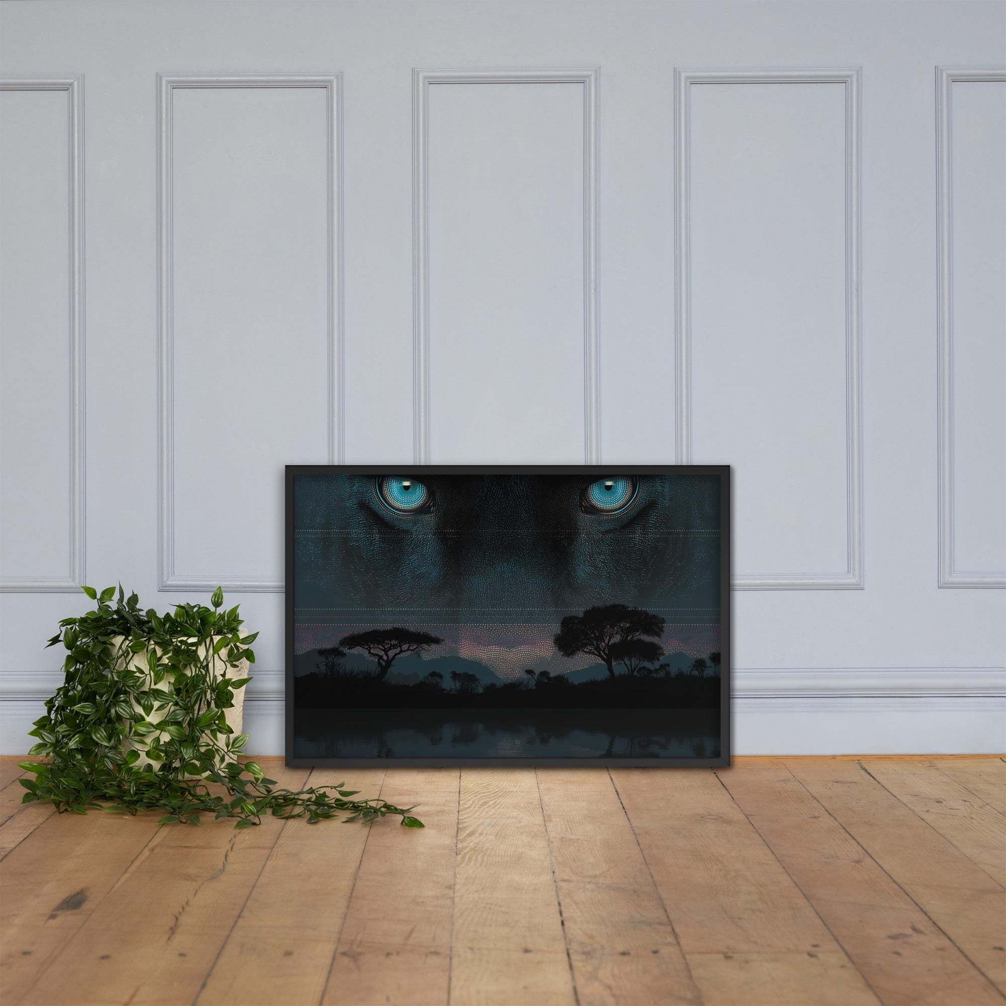 Step into the wild calm of the night. “Eyes of the Night” captures the quiet tension between mystery and serenity — the gaze of a hidden predator watching over an African landscape at dusk. Deep blues, shadowed silhouettes, and a sleek matte black frame make this piece the ultimate statement of elegance and power.